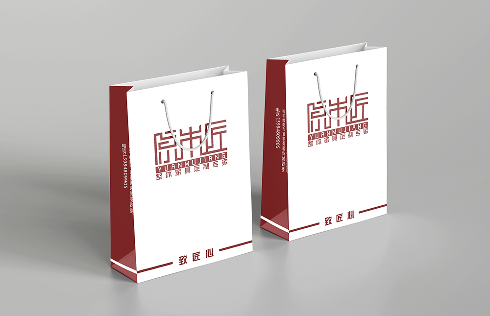 設計理念:本款家具手提袋設計以簡潔為主,以白色為主體顏色,正面以紅色logo“原木匠”突出主題,紙袋兩側邊放置公司定制、名稱、電話、二維碼等信息。