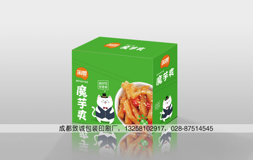 素毛肚又名魔芋爽,因其是用魔芋粉制成而得名;魔芋爽既有毛肚的爽脆口感、又有素菜的美容瘦身功能,所以受到廣大好吃嘴的喜愛,在超市的零食區總是能看到素毛肚整齊的擺放在貨架上,有的是一袋袋的,也有的是一盒盒的,我公司專業為各大廠家定制生產各類食品紙盒,也包括素毛肚包裝盒,如下面這款: